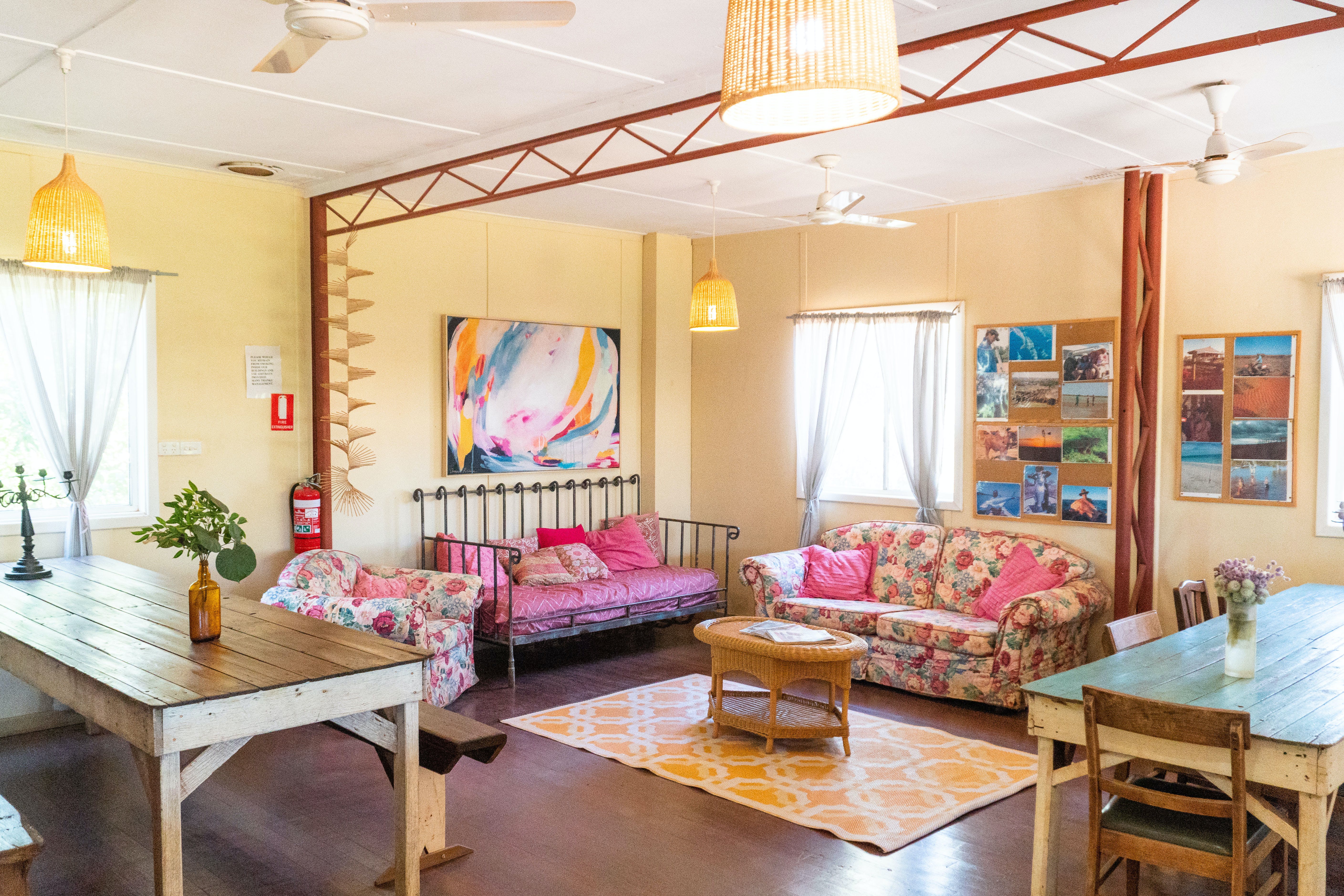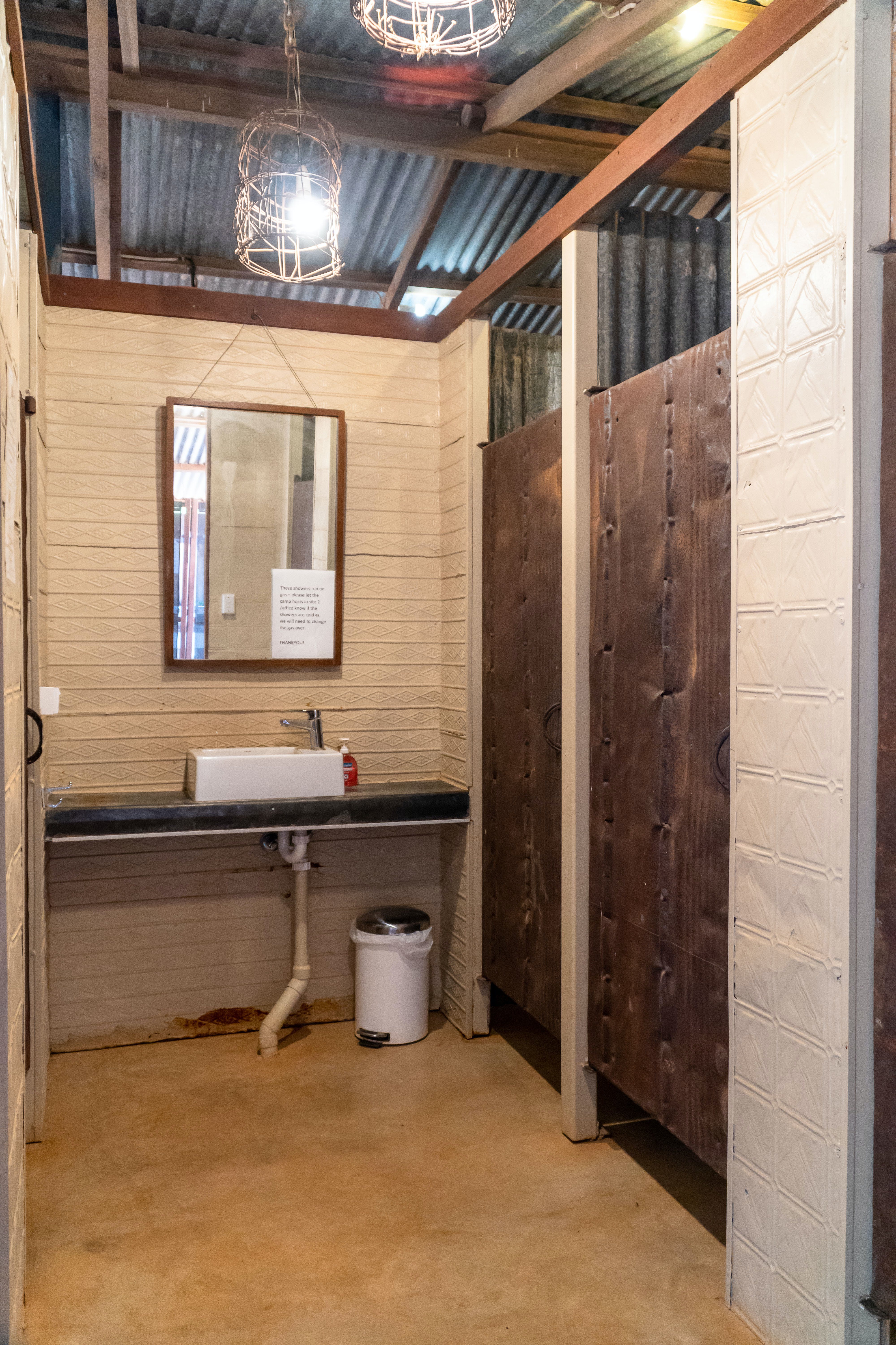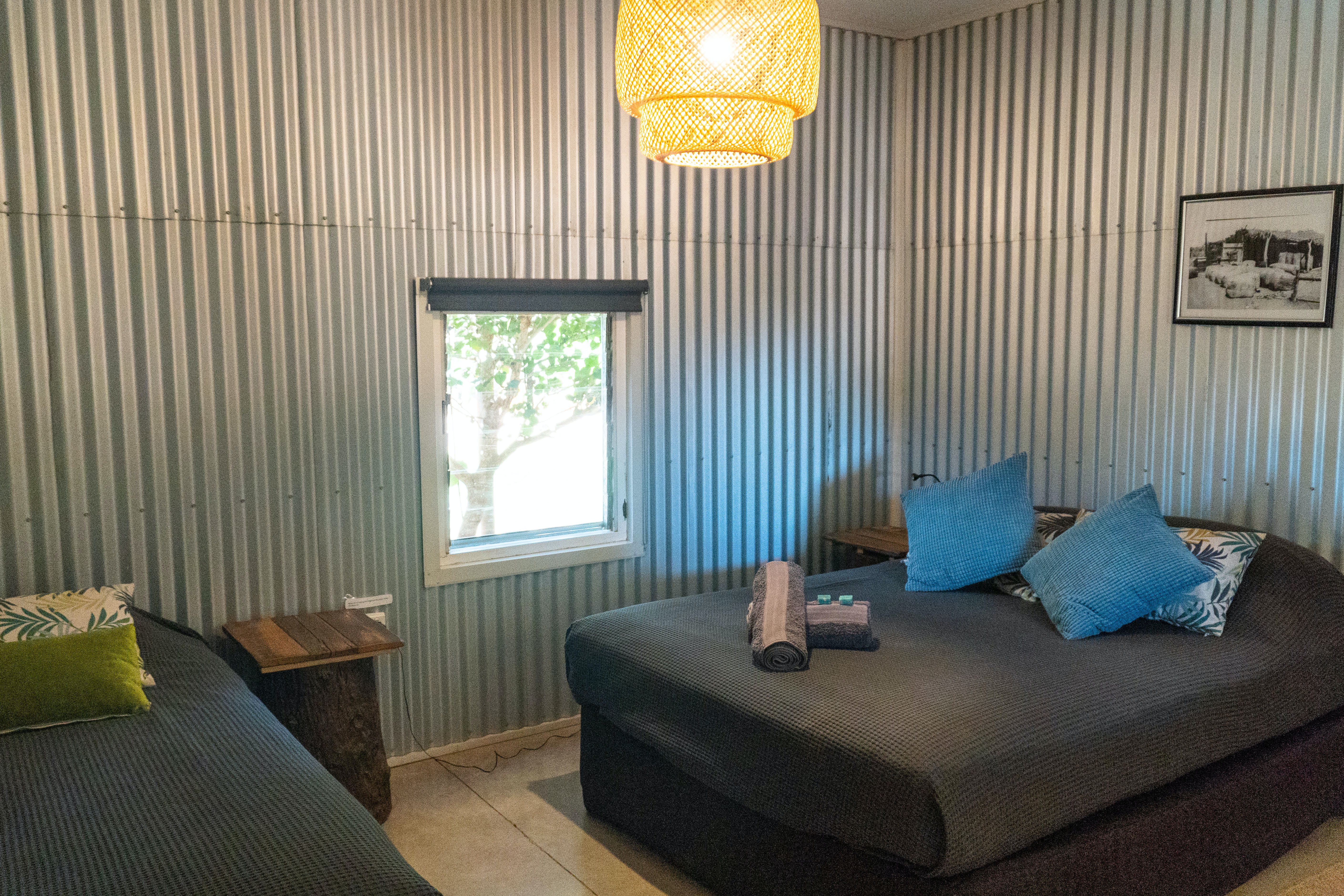 Refurbished with cool concrete floors and new tin walls the style is rustic charm with a fabulous contemporary flair. Everyone is charmed by the uniqueness of this accommodation. Guests have exclusive access to comfortable living which includes shared kitchen/dining facilities, a barbecue area and a fire pit. Experience outdoor communal toilets and showers. Each of the six rooms is side by side with a common verandah adorned with chairs and a hammock. The lodge is perfect for couples, a group of friends or famiy. Book the whole place out for your next holiday. There is a communal dining room and self-contained kitchen with all the amenities needed to prepare a fabulous feast. This facility is exclusive to the guests in the lodge. Tropical gardens with a green lawn, barbecue area and fire pit, make this space a relaxing oasis. There is no television here, time is best spent around the campfire with loved ones. Accommodation in the lodge consists of four queen rooms with a Queen bed and King Single bed (which allows for the rooms to become triple) and two twin rooms (one has a King Single and Single bed, the other has single bed bunks).