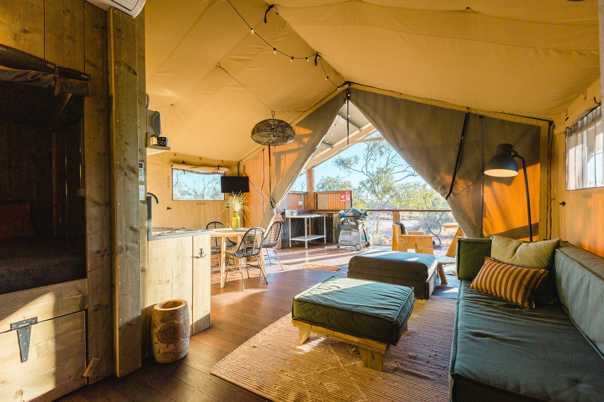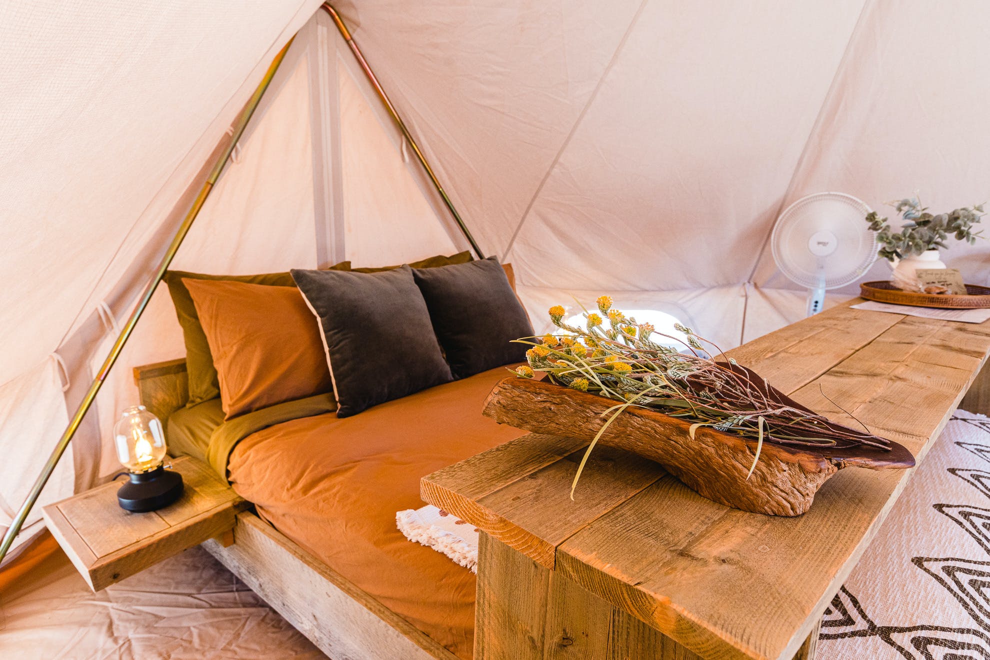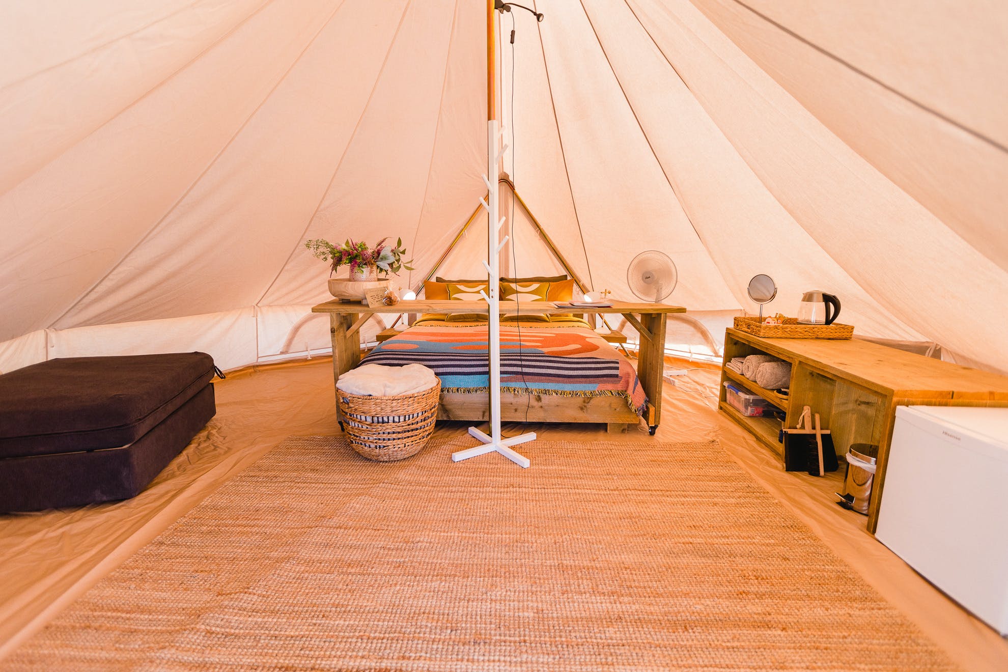 Outback glamping is taken to the next level in the bell tents; Little Wren and Willy Wag Tail. The perfect option for those keen to try camping, but without sacrificing comfort and little luxuries such as a cosy queen bed with soft, stylish linen. The tasteful bell tents have the camping bits you need, with an essentials box filled with plates, cutlery, glasses and even an electric kettle. The bell tents have access to communal showers and toilets - perfect for an outdoor shower under the stars. It's camping made glamourous. Guests have access to a communal kitchen space. No pets allowed.