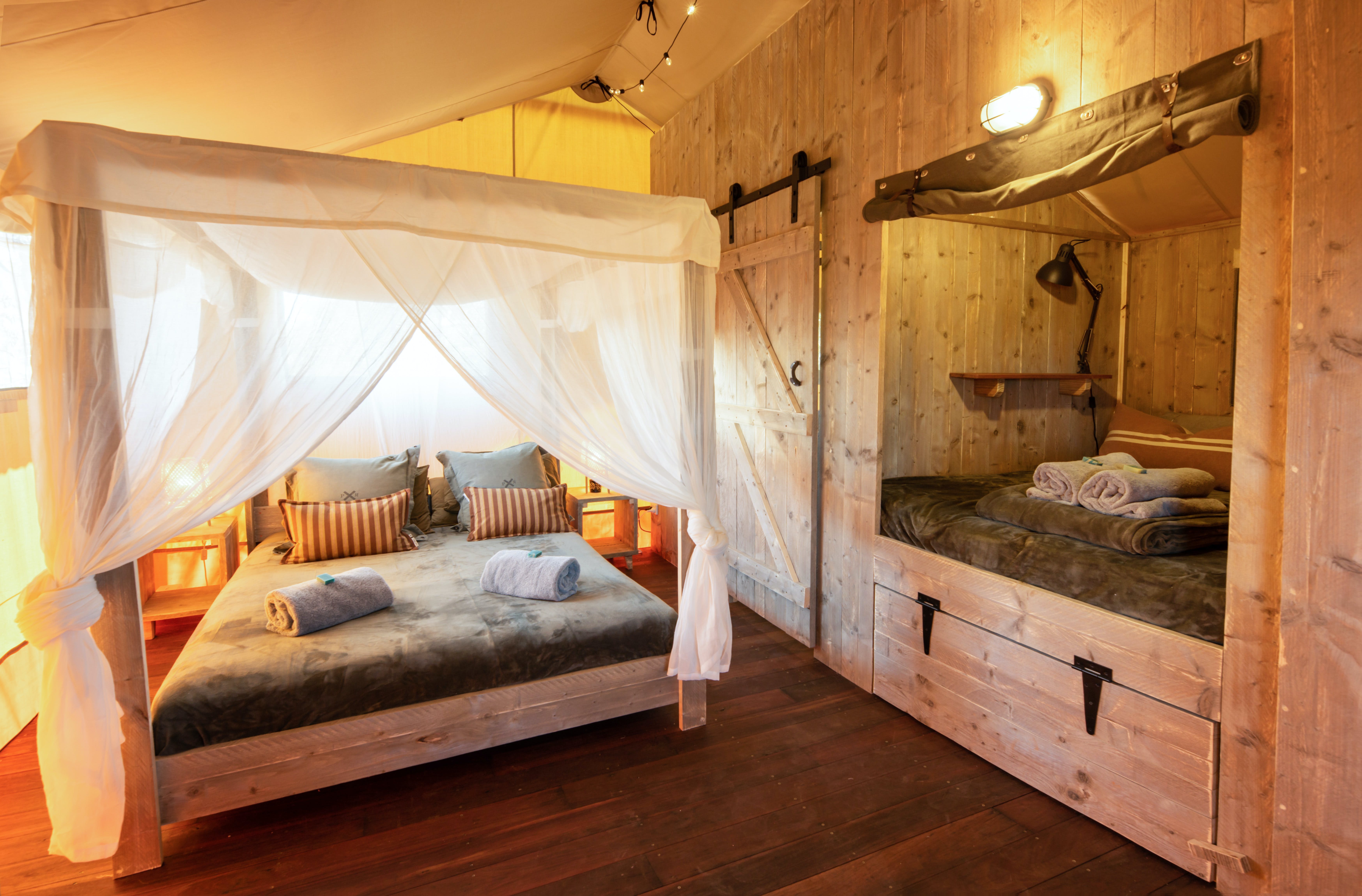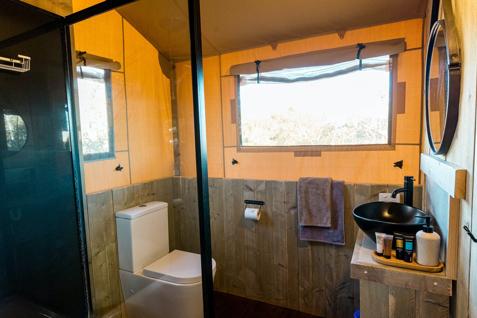 Experience luxury in the wilderness in one of our safari huts; Bower Bird and Kingfisher. Hidden away from the campsite, the safari huts are secluded in a quiet area, with only the sounds of native birds and overlooking beautiful gum trees. The cosy safari huts are fully self-contained and have a verandah with a barbeque. It features a queen and a double bed, a bathroom with a hot shower, a kitchen, a lounge area and a verandah for private use.