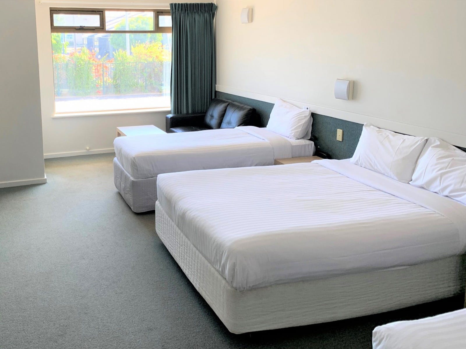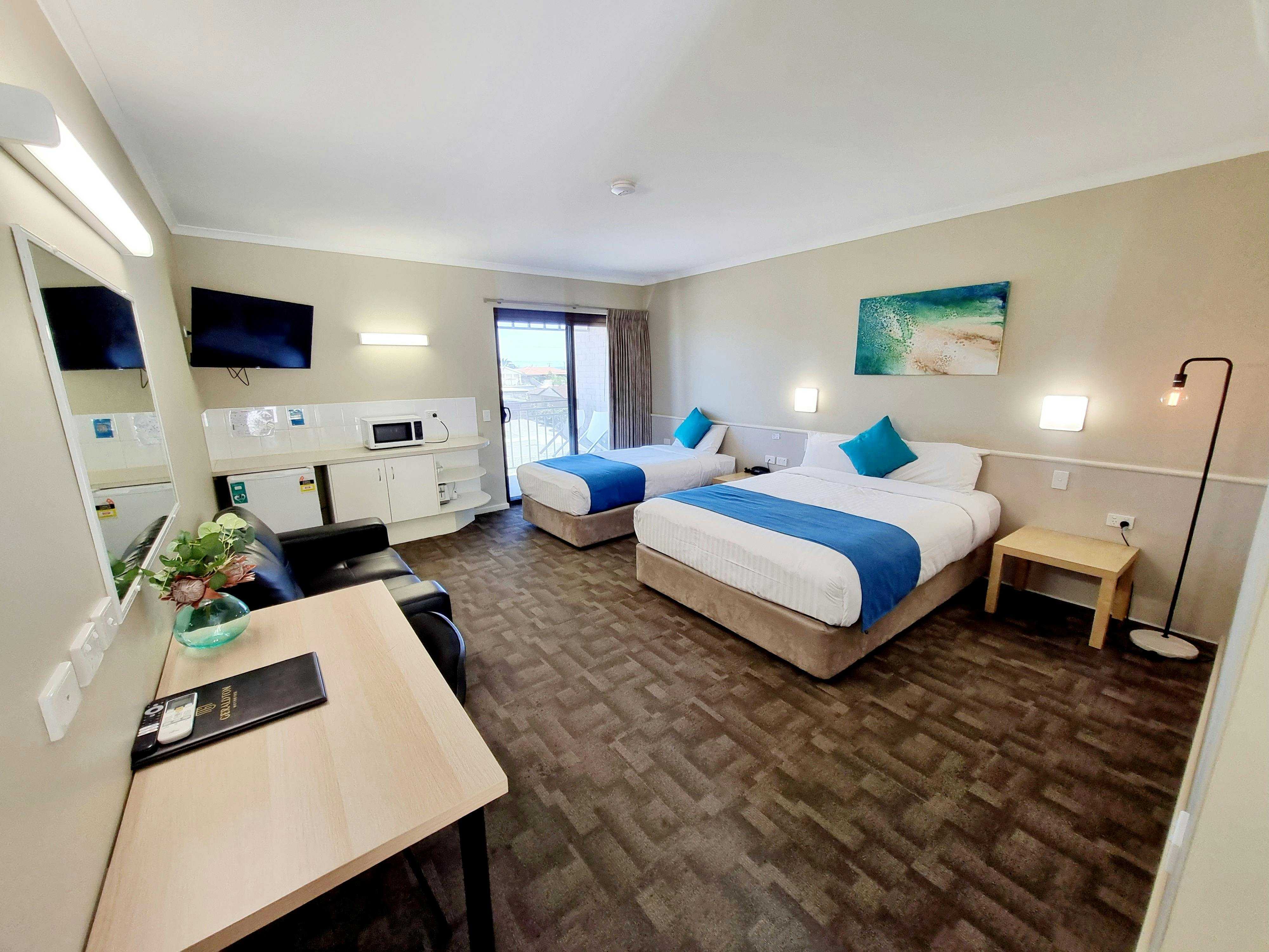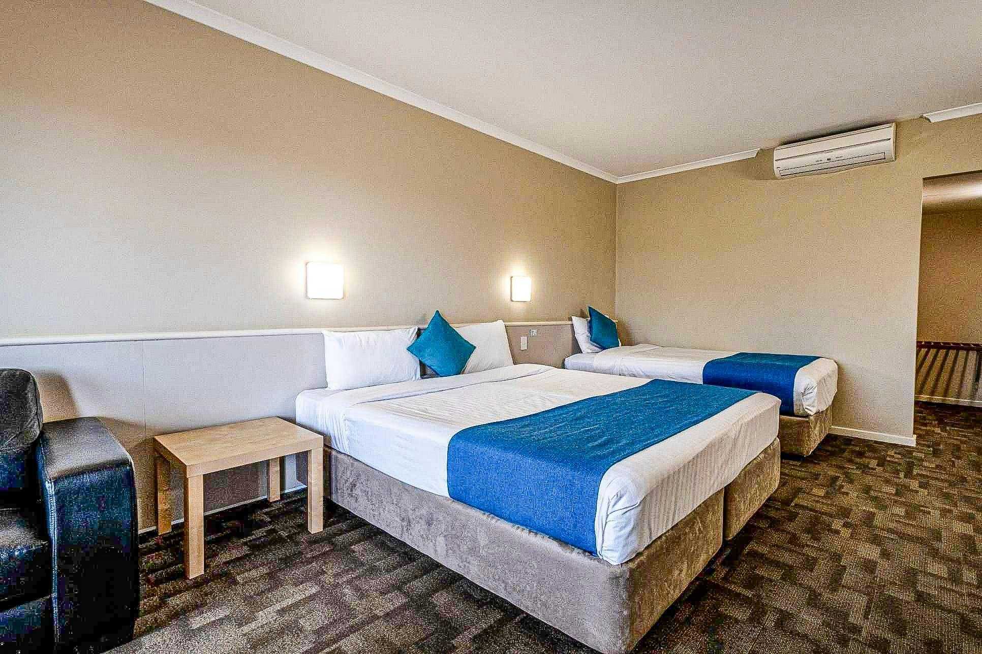 These modern, spacious hotel rooms have one queen and one king single bed, a separate ensuite and dressing room. Linen and towels provided. Other features include air conditioning, television, lounge, desk, microwave, mini fridge, kettle, hair dryer and ironing facilities. Twin rooms with balcony (upper level) or without (ground floor), subject to availability. Complimentary breakfast buffet available to inhouse guests 5.00am-8.30am daily!
