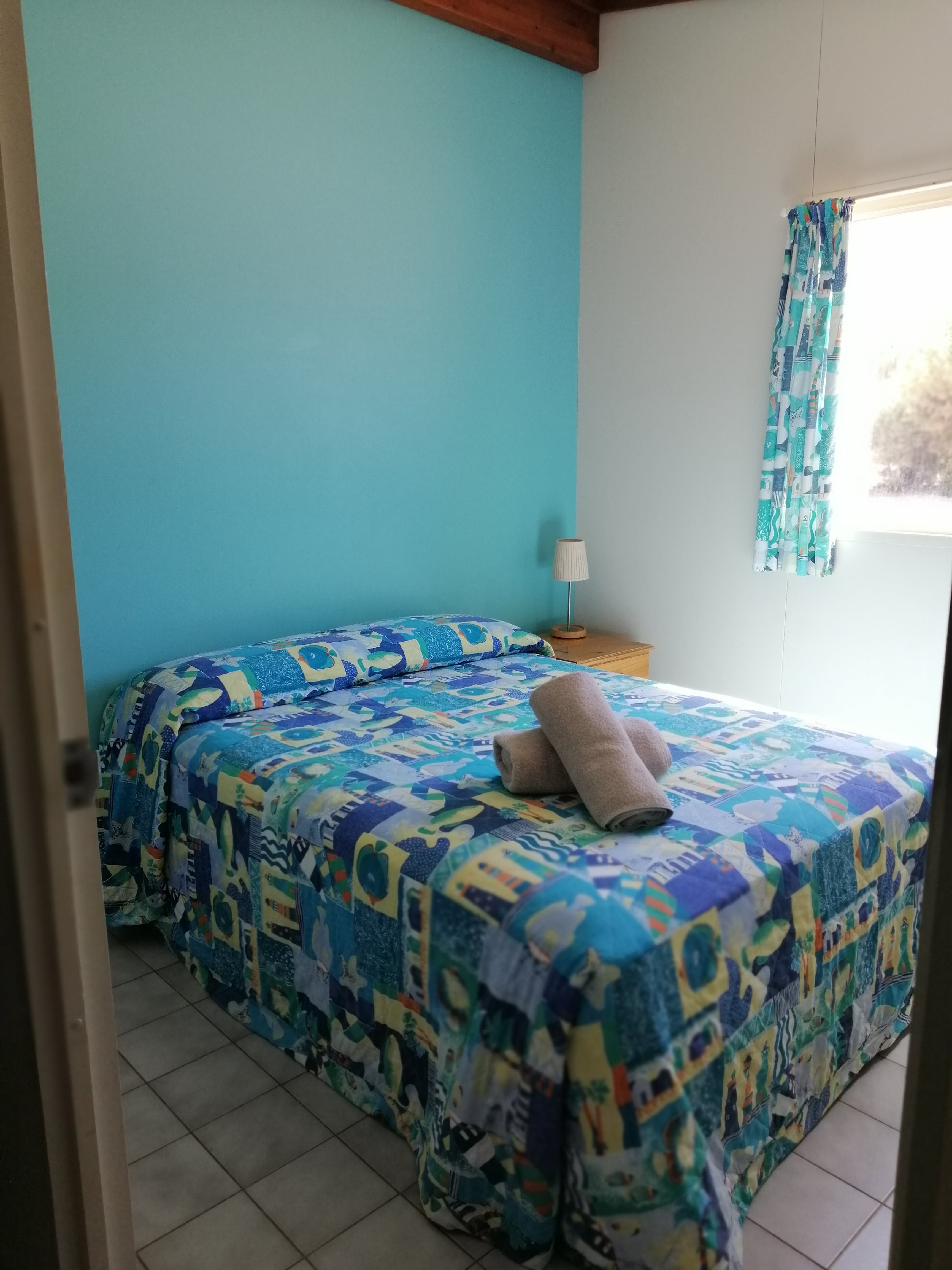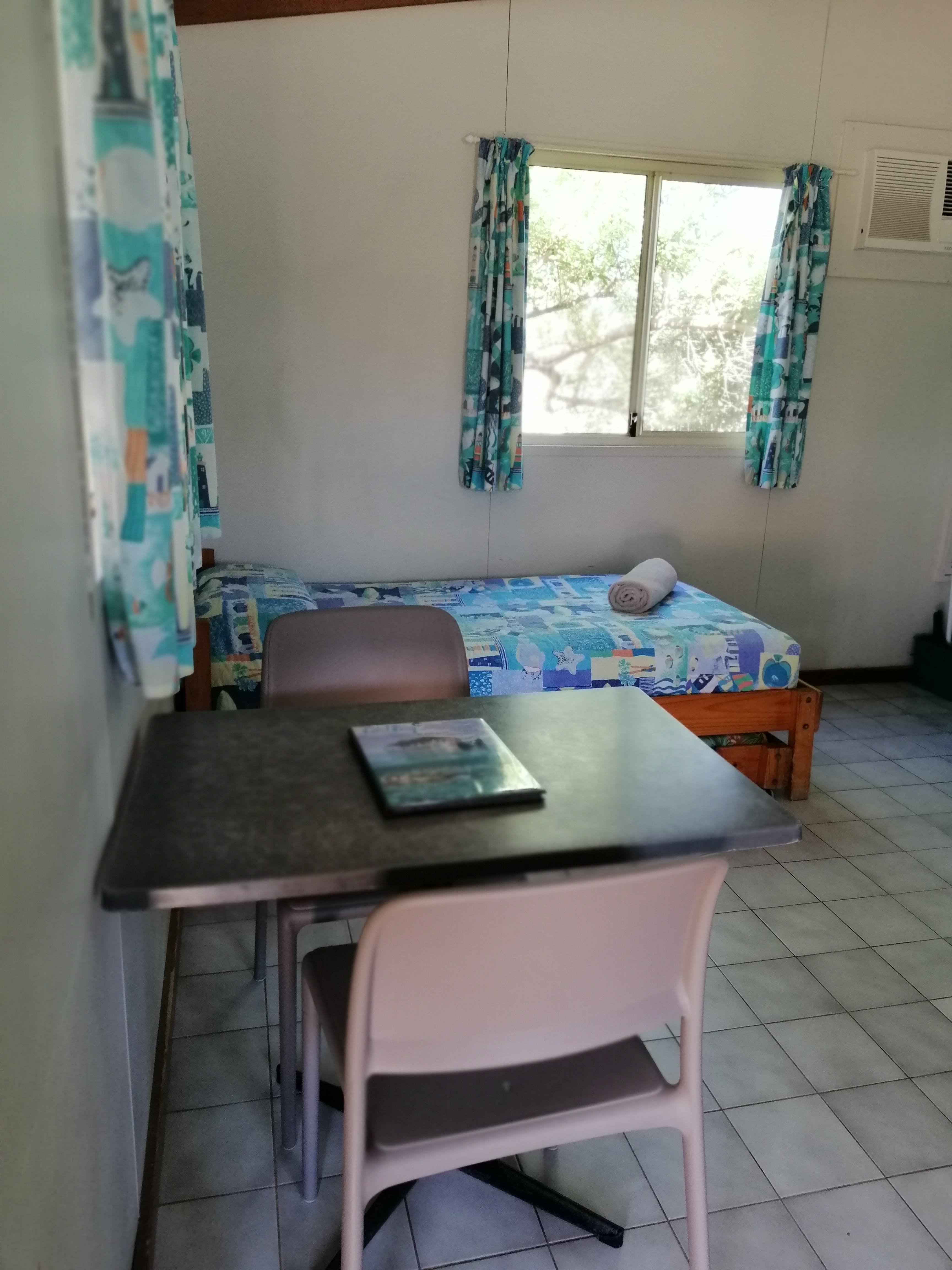 The One-bedroom Chalets are air-conditioned, duplex-style units with linen provided. Ideal for couples or small families on a budget, these air-conditioned chalets have one bedroom with a Double bed and en suite shower and toilet, along with a single and trundle bed in the kitchen/living area. Basic kitchen is equipped with a medium refrigerator, microwave and gas stove/oven. Please note there is no television in this unit.