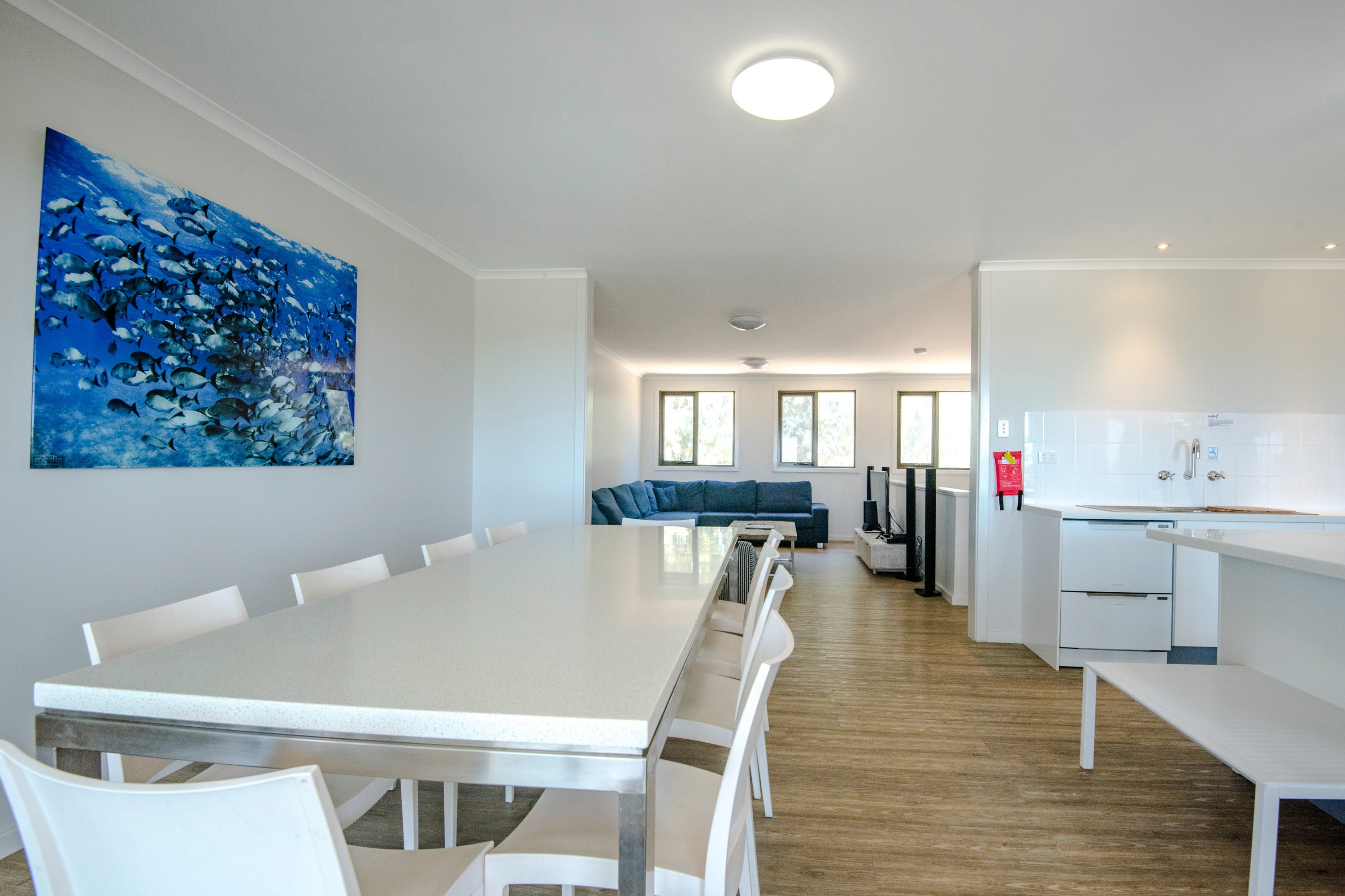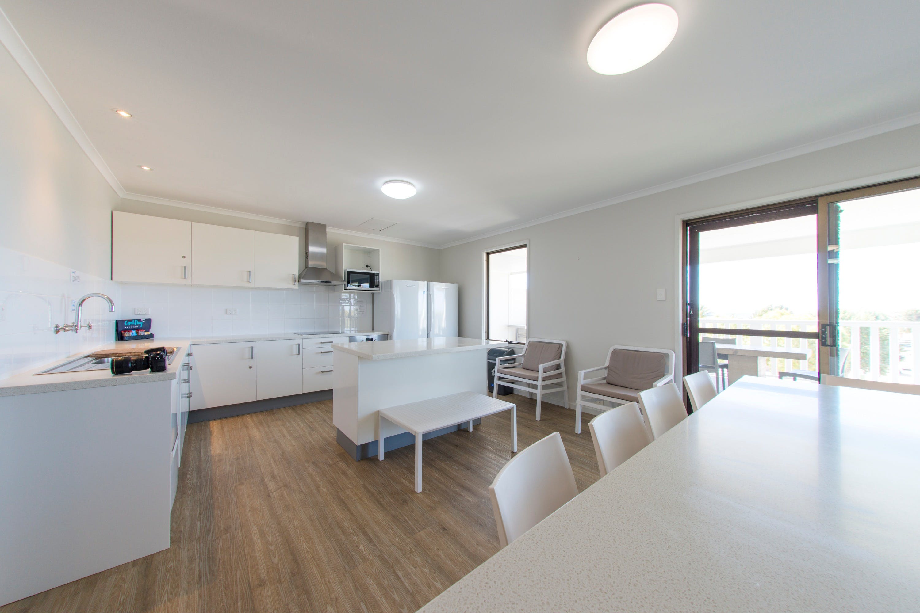 The beachfront Bayview Villas are ideally located across the road from Bill's Bay beach, offering sweeping ocean views from either first-floor balcony or a ground-floor verandah. Perfect for families or couples looking for a hint of luxury for their Ningaloo Reef experience. Air-conditioned bedrooms and a spacious open plan kitchen/living area with floor-to-ceiling windows open onto a private furnished balcony or verandah with panoramic ocean view. The spacious interior is furnished with a dining table and chairs, along with a comfortable leather lounge suite and a large wall-mounted TV. Adjacent is the fully equipped kitchen including a large fridge, induction cooktop, microwave and dishwasher. The Two bedroom Villas offer a King bed and two sets of single bunk beds. Four of the Villas have an additional bedroom with two King single beds.