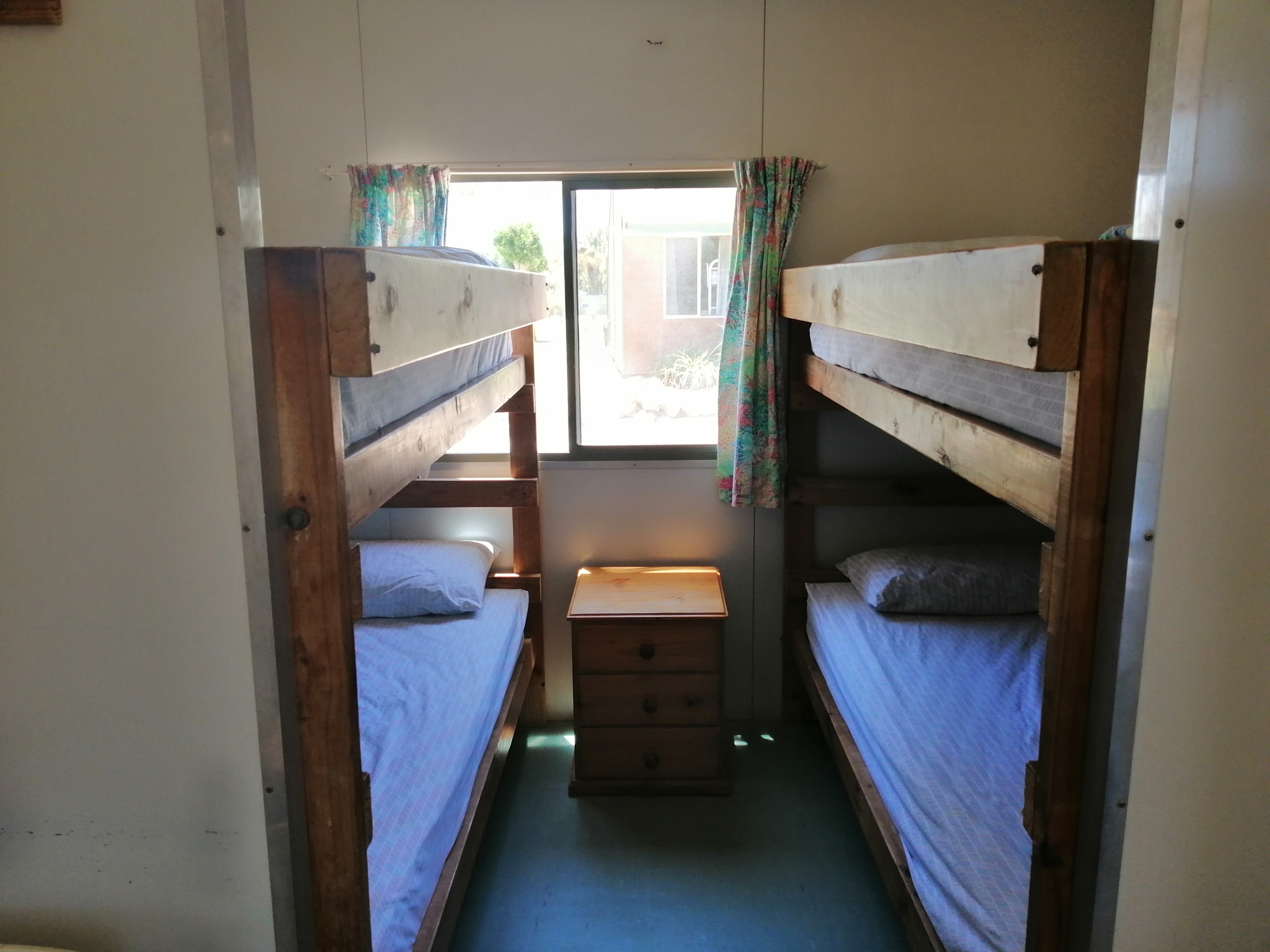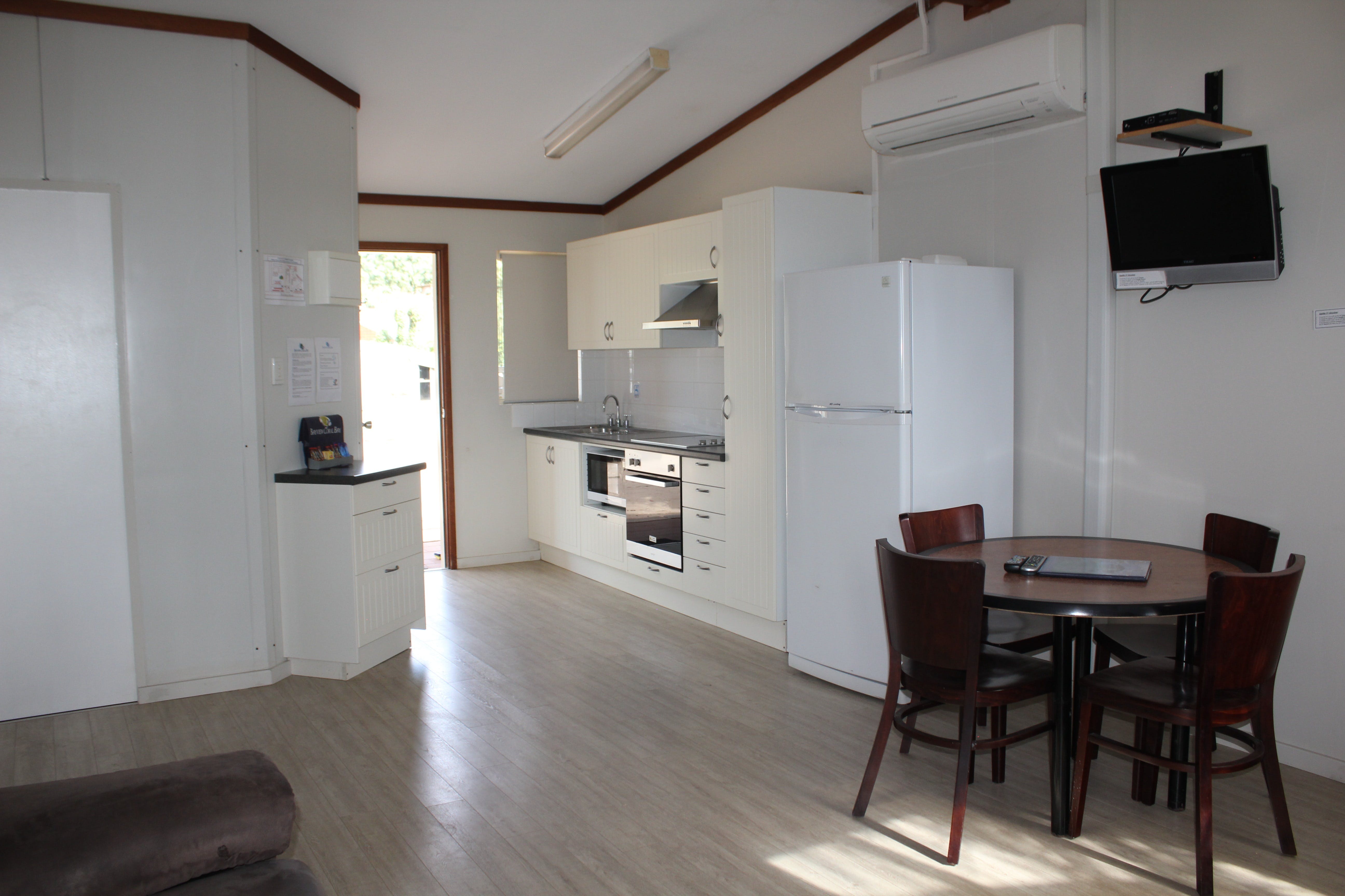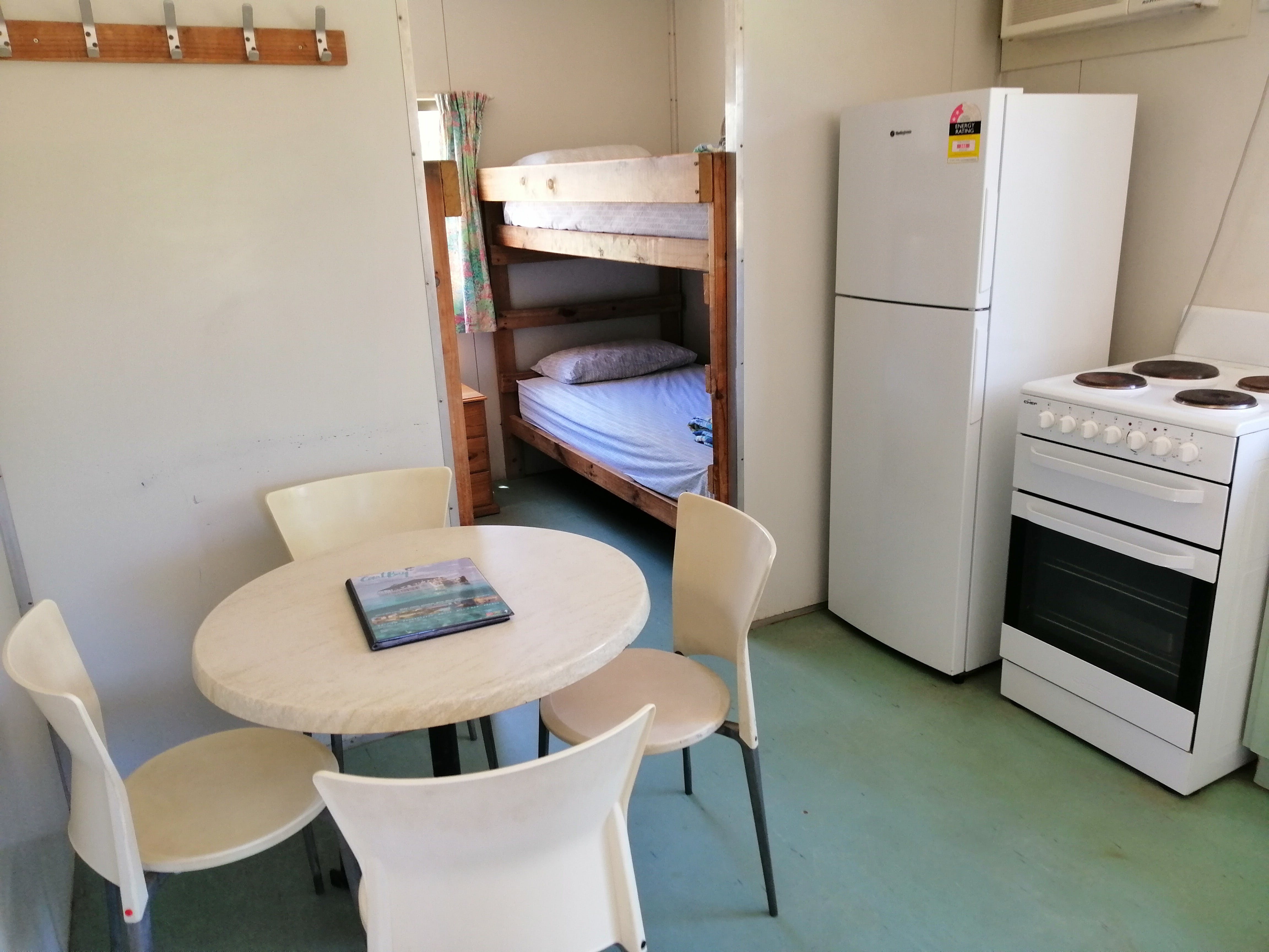 Family Cabins are an open plan budget cabin with beds located at each end. Offering basic kitchen, including medium refrigerator, microwave, gas or electric stove/oven and small dining table, these cabins are air-conditioned with bed linen and bath towels provided. Guests have use of the Park ablution blocks for shower and toilet. Two cabins are available with a Double bed and two single bunks and two cabins with two triplex bunks. Sleeps a maximum of two adults and four children, or four adults, two children respectively.