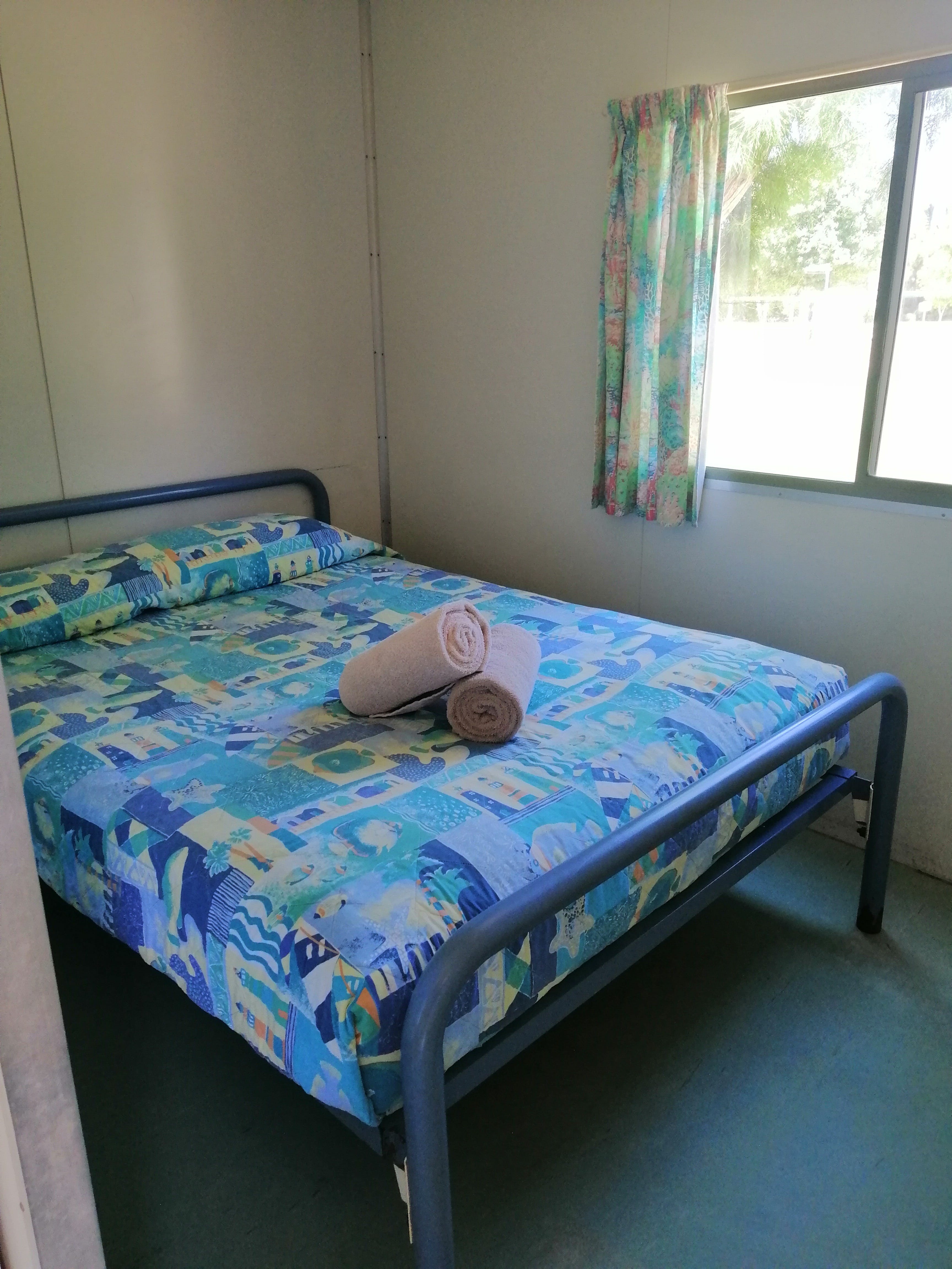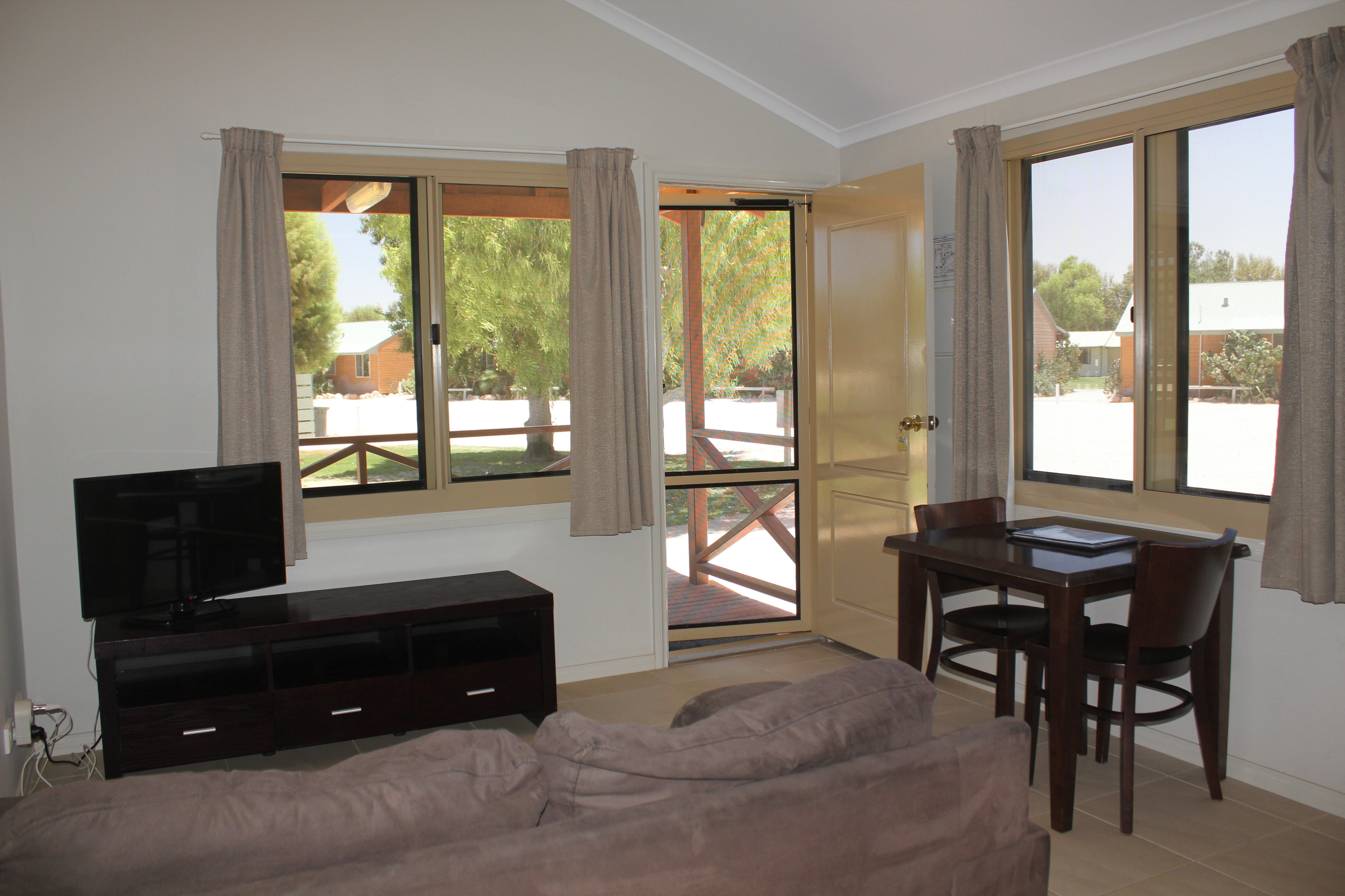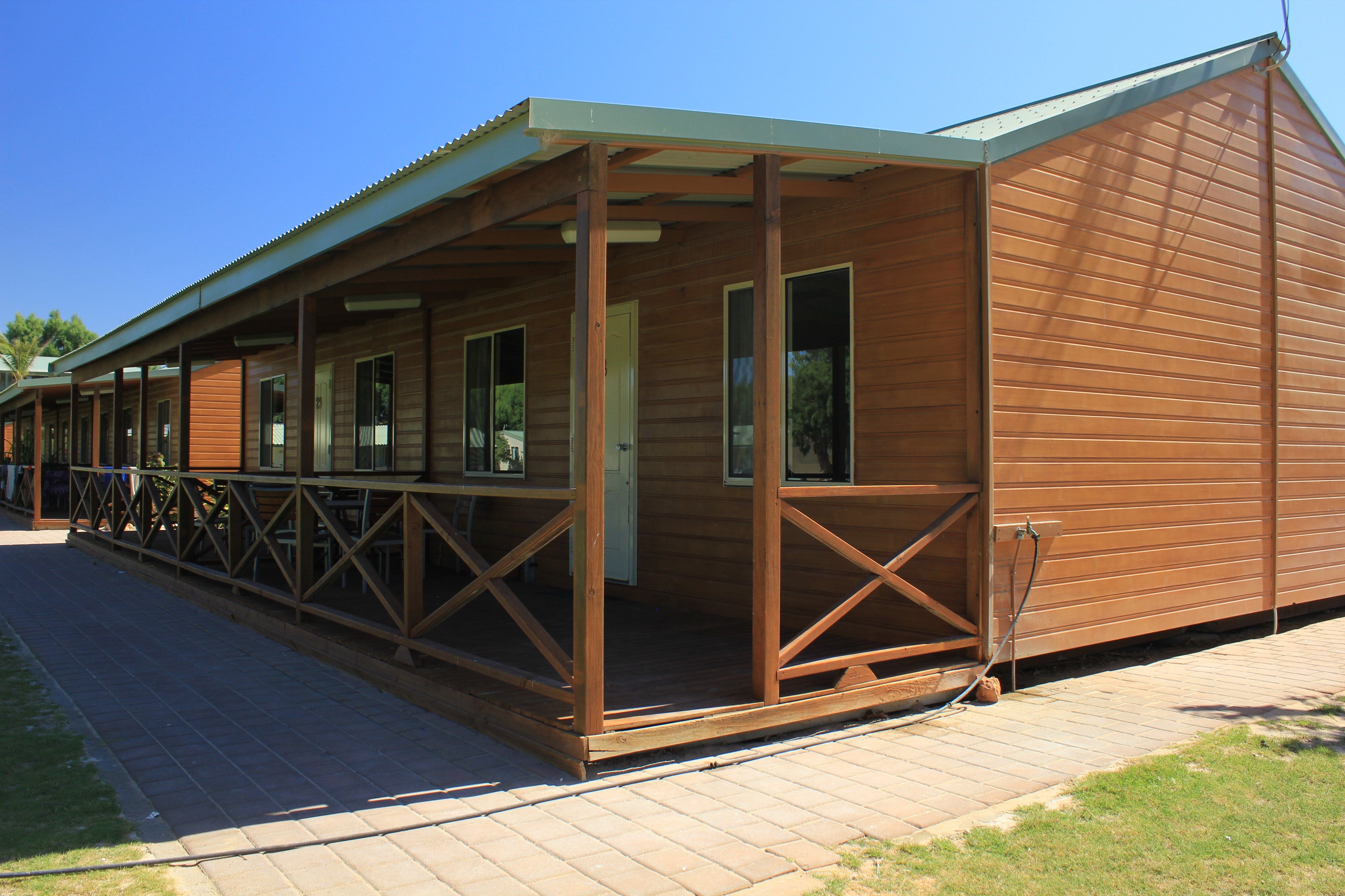 Family Cabins are an open plan budget cabin with beds located at each end. Offering basic kitchen, including medium refrigerator, microwave, gas or electric stove/oven and small dining table, these cabins are air-conditioned with bed linen and bath towels provided. Guests have use of the Park ablution blocks for shower and toilet. Two cabins are available with a Double bed and two single bunks and two cabins with two triplex bunks. Sleeps a maximum of two adults and four children, or four adults, two children respectively.