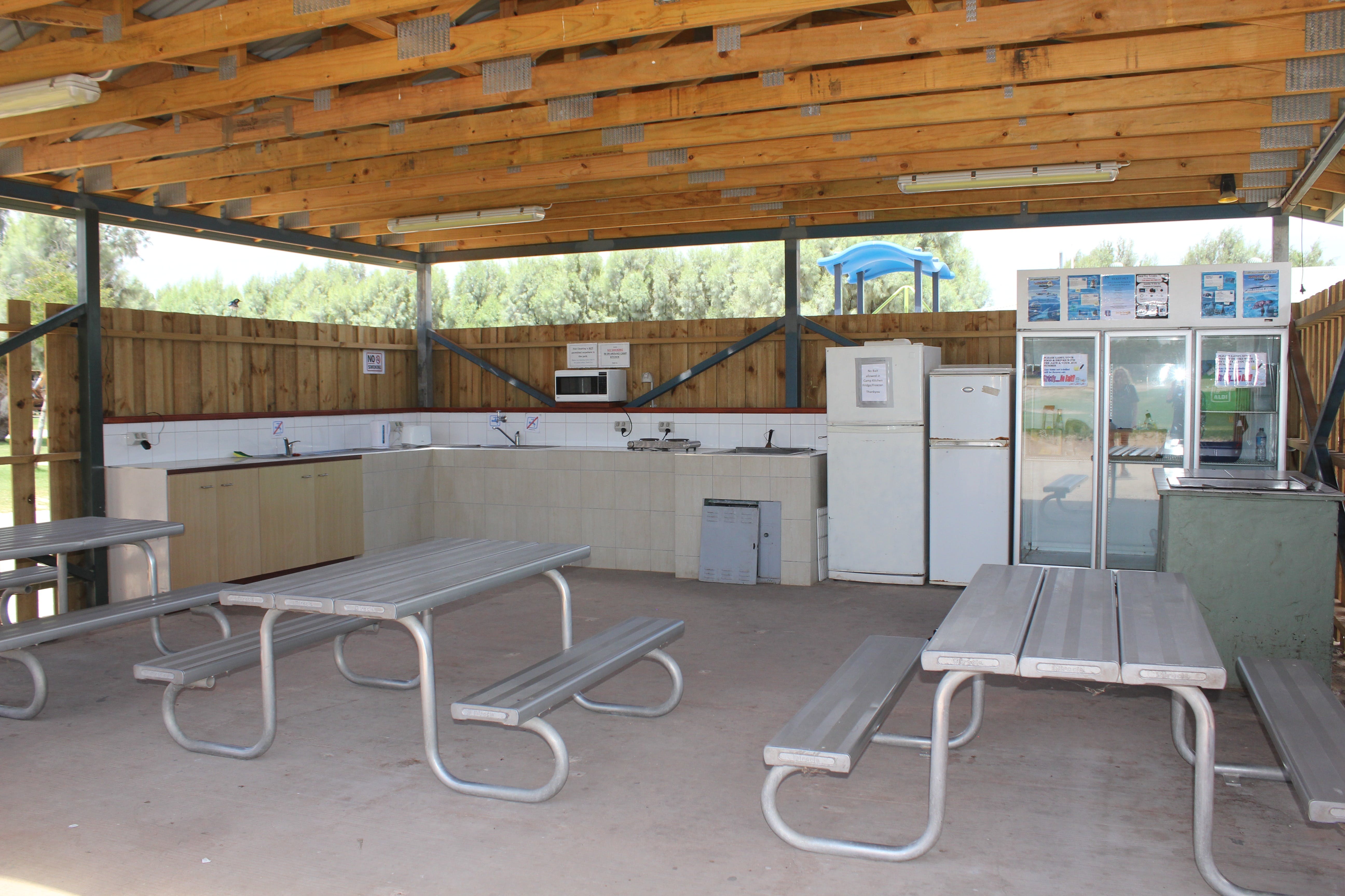 Guests can enjoy their jumping pillow, playgrounds, swimming pool, tennis courts, barbecues, camp kitchen and the convenience of ablution blocks throughout the park, with artesian water showers and desalinated drinking water.