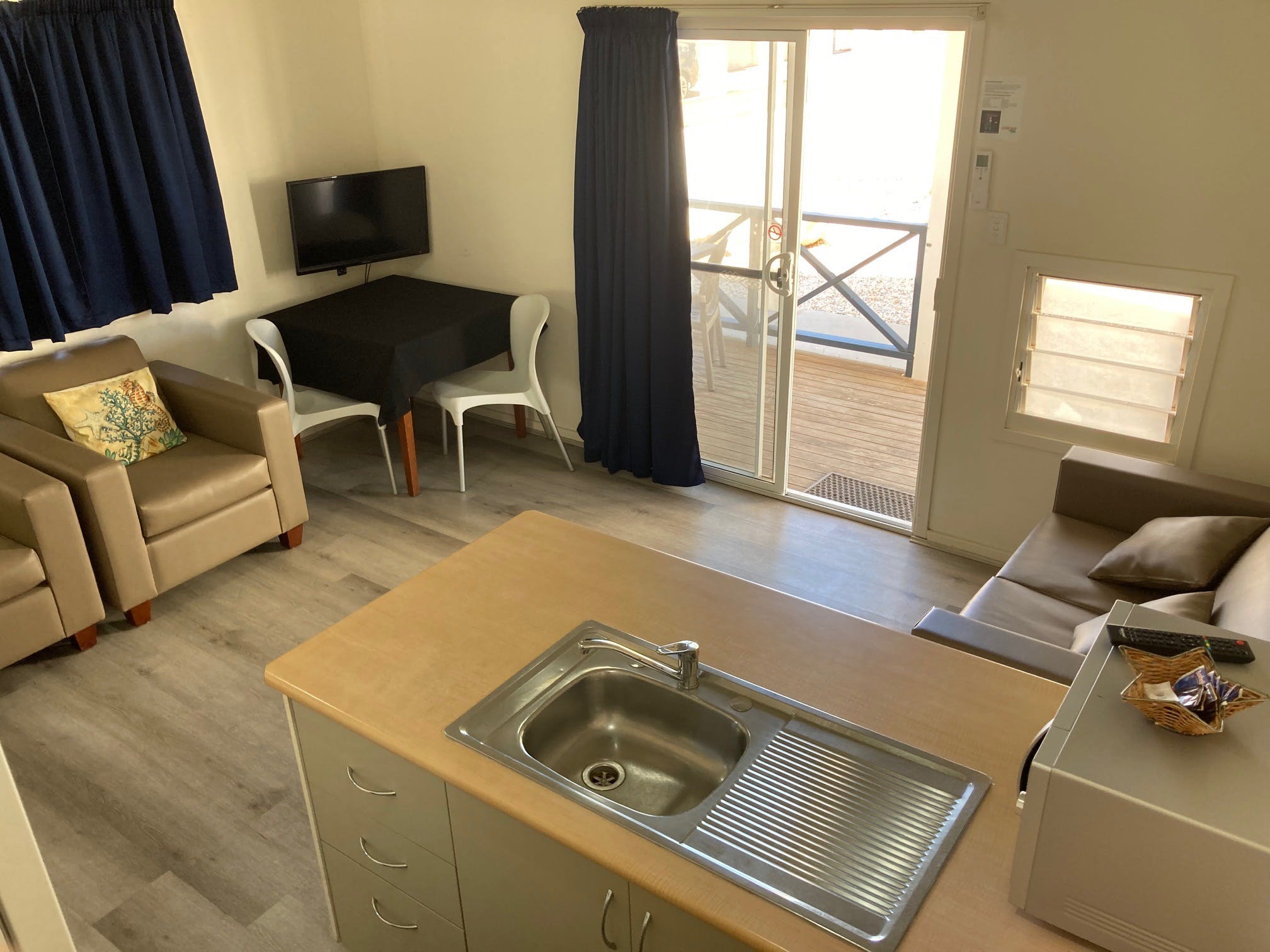 The Panorama Villas have an elevated position at the rear of the complex and is approximately 60 metres from the beach with stunning coastline panoramic views of Shark Bay and Dirk Hartog Island. Sit back on your private balcony and have a barbecue whilst watching Australia's last sunset. Bedroom One contains one queen bed, whilst Bedroom Two contains either two single beds (one being a roll-away full-size single bed with a quality mattress) or bunks and a roll-away. Enjoy free in-room WiFi and Foxtel with the comfort of air-conditioning and ceiling fans. Fully self-contained villas come with your own kitchen, bathroom, linen and towels.
